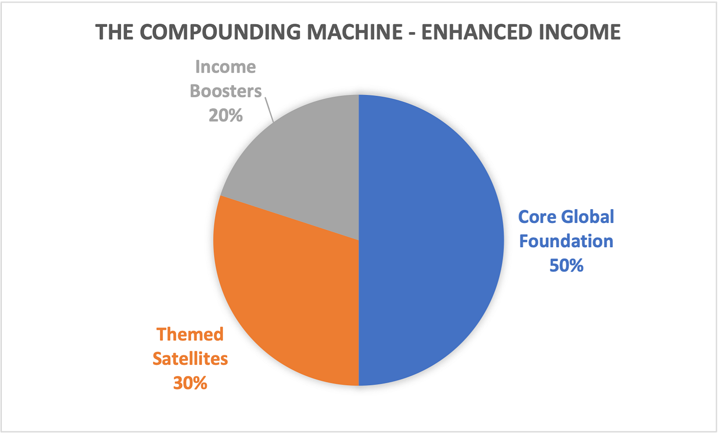 To that end, I’m going to create two model portfolios, by way of example. The first will be an enhanced income version that will consist of 50% Global Foundation, 30% Themed Satellites and 20% Income Boosters.