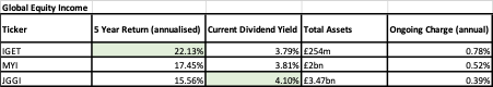 I want to select the best 3 funds overall. The first 2 are straightforward as both Invesco Global Equity Income (IGET) and Murray International (MYI) are not only the top performers over 5 years but they also pay a higher dividend than the Global Equity category. The third spot is a closer call. Brunner Investment Trust (BUT) has returned 16.29% annualised and pays a dividend of 1.82% (total 18.11%) against a slightly lower return for JP Morgan Global Growth & Income (JGGI) of 15.56% annualised but with a higher dividend of 4.10% to give a total of 19.66% which means it just clinches it.
