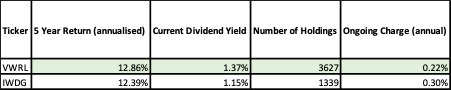 In this instance, VWRL marginally edges the comparison on each dimension and while past performance is never any guarantee of what might happen in the future, I am comfortable making VWRL the linchpin and benchmark of our model Compounding Machine portfolio.